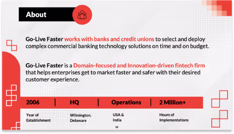 Go-Live Faster is a global fintech solutions firm that helps banks accelerate their product releases by making technology implementations predictable. We are a team of brutally honest analysts who ensure that you make the right decisions to solve complex product release problems while balancing risk. With offices in Wilmington, DE, and Kansas City, MO, our clients include banks and diverse financial services institutions across the spectrum.